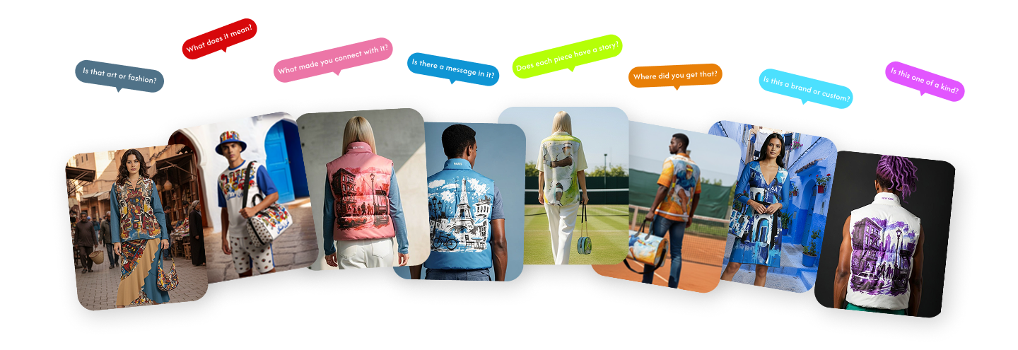 Our pieces begin as original artworks, created to express ideas, emotions, and stories. These artworks are then transformed into wearable forms using premium-quality fabrics, carefully selected for their feel, durability, and presence. Every garment is designed to carry the weight of the artwork it represents—both visually and physically—so what you wear feels as intentional as what you stand for.